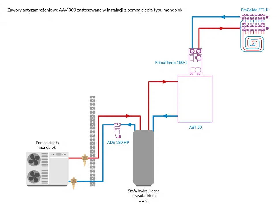 - Montowany na rurze powrotnej i zasilającej na zewnątrz budynku jak najbliżej jednostki zewnetrznej.
