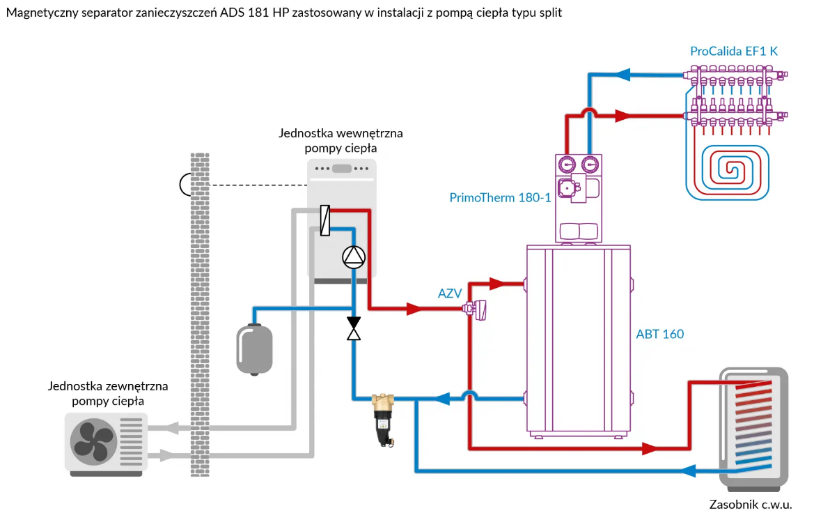 - Montowany przed źródłem ciepła/chłodu na powrocie z instalacji.