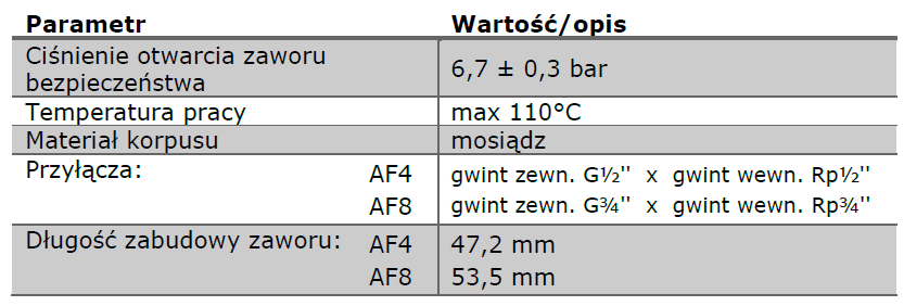 Zawory bezpieczeństwa AF4 oraz AF8 są elementem zabezpieczającym przeznaczonym wyłącznie do elektrycznych podgrzewaczy ciepłej wody użytkowej o maksymalnej temperaturze wody 90°C i ciśnieniu znamionowym 6 bar.