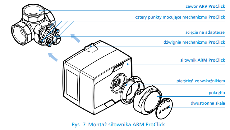 Siłownik ARM ProClick ustawiony jest fabrycznie na 50% otwarcia (pozycja „5” skali na pokrętle). Aby siłownik prawidłowo zamontować na zaworze, należy zawór mieszający ustawić również na 50% otwarcia.