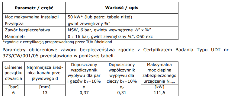 Membranowy zawór bezpieczeństwa AFRISO typu MSW, który zamontowano w grupie DN15 został przebadany przez TȔV Rheinland, posiada deklarację CE potwierdzającą zgodność z dyrektywą ciśnieniową PED 97/23/EC, Certyfikat Badania Typu nr 373/CW/001/05 wydany przez Urząd Dozoru Technicznego oraz Atest Higieniczny PZH nr HK/W/0988/01/2009.