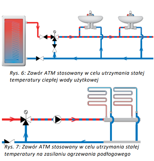 Termostatyczne zawory mieszające ATM posiadają możliwość regulacji temperatury ciepłej wody użytkowej. Dodatkowo wyposażone zostały wfunkcję „bez oparzeń”. Powoduje ona zablokowanie dopływu wody ciepłej wwypadku awarii dopływu wody zimnej. Do użytku winstalacjach ciepłej wody użytkowej zalecane, są zawory termostatyczne ozakresie nastawy 30÷65ºC.