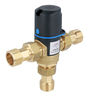 Zawory termostatyczne mieszające ATM powinny być stosowane wszędzie tam, gdzie niezbędna jest ochrona przed poparzeniem oraz wskazana jest szybka reakcja na zmiany temperatury i ciśnienia wody. Zawory ATM umożliwiają bezpieczne przegrzewanie wody w zasobnikach c.w.u. w celu ochrony przed bakteriami Legionelli, bez narażania użytkowników na poparzenie. Funkcja „bez oparzeń” powoduje zablokowanie dopływu wody ciepłej w wypadku awarii dopływu wody zimnej. W instalacjach grzewczych, np. ogrzewania podłogowego zawory ATM mogą zastępować rozbudowane i kosztowne układy regulacji. Pod plastikową pokrywką, chroniącą przed przypadkową zmianą nastawy, znajduje się pokrętło do ustawienia temperatury wody zmieszanej. Zawory termostatyczne ATM podczas pracy nie wymagają czynności konserwacyjnych i mogą być montowane w dowolnej pozycji. Przeznaczone są do pracy z czystą wodą lub wodą zawierającą maksymalnie 50% glikolu. Wykonane są z mosiądzu DZR.