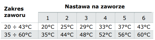 Ze względu natemperatury pracyinstalacji ogrzewania podłogowego zalecamy termostatyczne zawory mieszające ATM zzakresami regulacji temperatury 20 ÷ 43°C. Utrzymywanie teperatury zasilania instalacji ogrzewania podłogowego wtym zakresie ma kluczowe znaczenie dlaoptymalnego komfortu użytkowników zpunktu widzenia fizjologii człowieka. Dlatego nie zaleca się zwiększania maksymalnych temperatur zasilania powyżej 38°C (nastawa „5” nazaworze ATM).