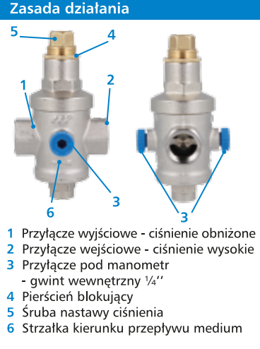 Reduktory ciśnienia BPR posiadają przyłącza do manometru po obu stronach korpusu, dzięki czemu mogą być stosowane w rożnych położeniach w instalacji. Za pomocą śruby nastawczej dokonuje się regulacji ciśnienia wyjściowego. Obracając śrubę nastawy zgodnie z ruchem wskazówek zegara podnosimy ciśnienie za reduktorem. Przeciwnie do ruchu wskazówek zegara obniżamy ciśnienie za reduktorem. Fabrycznie, każdy z reduktorów ustawiony jest na wartość ciśnienia wyjściowego 3 bar. Za pomocą mosiężnego pierścienia ograniczającego blokujemy nastawę. Na korpusie reduktorów znajduje się strzałka wskazująca kierunek przepływu medium.