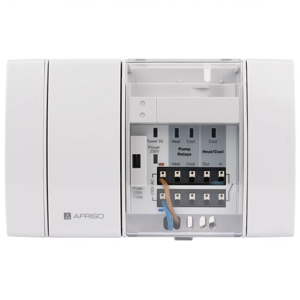 - Umożliwia sterowanie pracą pomp grzania i chłodzenia przez dedykowane styki przełączające.