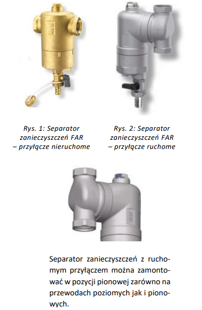 Separator zanieczyszczeń montowany jest w instalacji centralnego ogrzewania. Służy do usuwania zanieczyszczeń stałych, które mogą powodować uszkodzenie elementów instalacji.Separatory powietrza i zanieczyszczeń powinny być stosowane we wszystkich typach instalacji grzewczych. Separatory zanieczyszczeń odpowiadają za filtrację medium z wszelkich zanieczyszczeń stałych i są skuteczniejsze niż filtry siatkowe. Wyposażone są w jedną lub dwie wkładki magnetyczne do usuwania cząsteczek metalowych (np. rdzy). Separatory powietrza usuwają powietrze rozpuszczone w medium. Zastosowanie obydwu separatorów jednocześnie zwiększa żywotność instalacji i zabezpiecza urządzenia przed zanieczyszczeniem. Magnetyczne separatory FAR montuje się na powrocie, natomiast separatory powietrza na zasilaniu C.O.