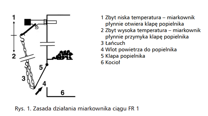 Temperatura wody w płaszczu wodnym kotła oddziałuje na termostat wbudowany w końcówkę miarkownika. Termostat miarkownika połączony jest przy pomocy dźwigni oraz łańcucha z ruchomą klapą na drzwiczkach popielnika kotła. W zależności od temperatury w płaszczu wodnym kotła, klapa jest płynnie otwierana lub zamykana zmieniając odpowiednio ilość dopływającego do paleniska powietrza. Zasada działania miarkownika ciągu FR 1 została zobrazowana na poniższym schemacie: