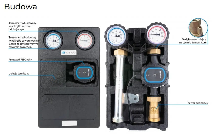 - Wyposażona w niezbędne komponenty: termometry, zawór zwrotny, zawory odcinające na zasilaniu i powrocie, zawór odcinający przed pompą i izolację termiczną.