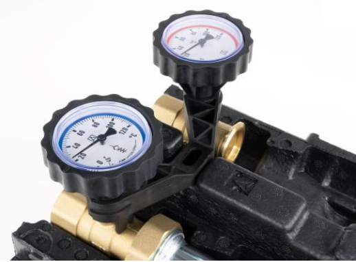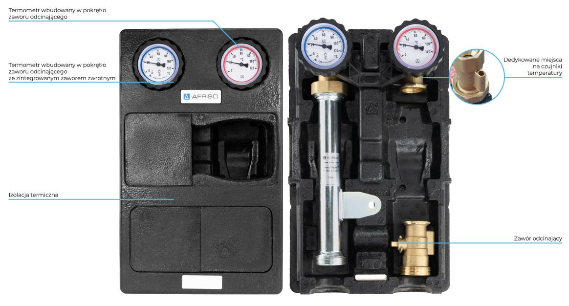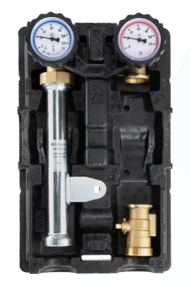 - Wyposażona w niezbędne komponenty: termometry, zawór zwrotny, zawory odcinające na zasilaniu i powrocie, zawór odcinający przed pompą i izolację termiczną.