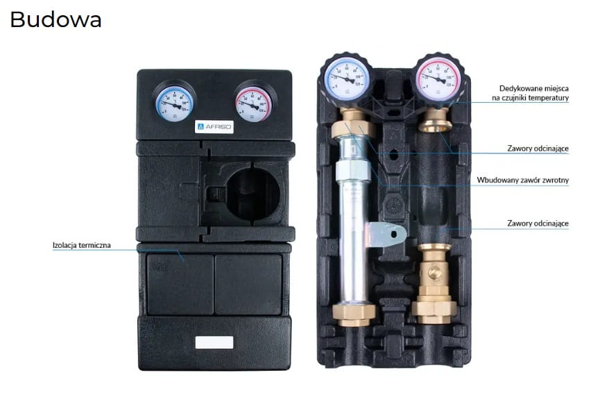 - Wyposażona w niezbędne komponenty: termometry do pomiaru temperatury zasilania i powrotu, zawór zwrotny, zawory odcinające na zasilaniu i powrocie, zawór odcinający przed pompą, izolacja termiczna.