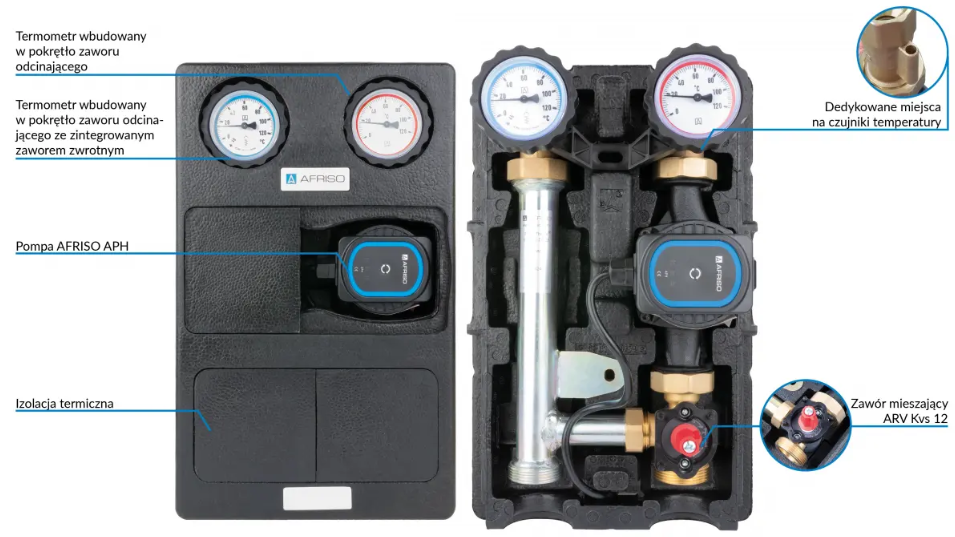 - Zainstalowany zawór mieszający ARV Kvs12 oraz pompa AFRISO APH 25-7/180.