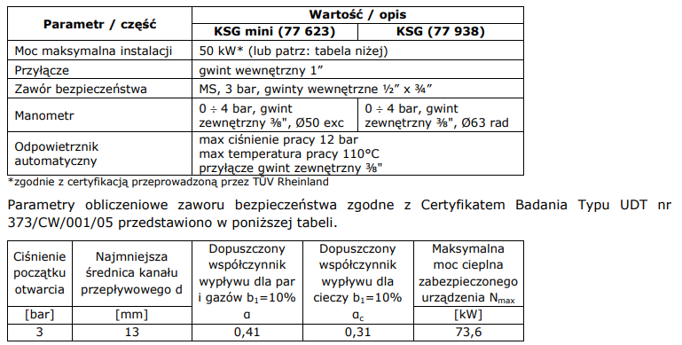 Membranowy zawór bezpieczeństwa AFRISO typu MS, który zamontowano w grupach KSG i KSG mini został przebadany przez TȔV Rheinland, posiada deklarację CE potwierdzającą zgodność z dyrektywą ciśnieniową PED 97/23/EC oraz Certyfikat Badania Typu nr 373/CW/001/05 wydany przez Urząd Dozoru Technicznego.