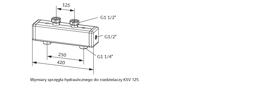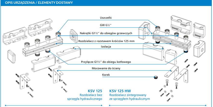 Wszystkie rozdzielacze KSV są fabrycznie testowane pod względem szczelności, posiadają izolację termiczną oraz wieszaki ścienne. Rozdzielacze KSV składają się z 2, 3, 4 lub 5 par przyłączy zasilających i powrotnych obiegów pompowych. Całość znajduje się w zdejmowanej izolacji termicznej. Wersja rozdzielaczy KSV HW wyposażona jest dodatkowo w sprzęgło hydrauliczne do rozdzielania obiegów oraz przyłącze do zamontowania zaworu spustowego lub czujnika temperatury. Przyłącza rozdzielacza ze strony kotła posiadają gwinty zewnętrzne G1 1/2”. Przyłącza od strony grup pompowych posiadają nakrętki z uszczelnieniem płaskim G1 1/2”.