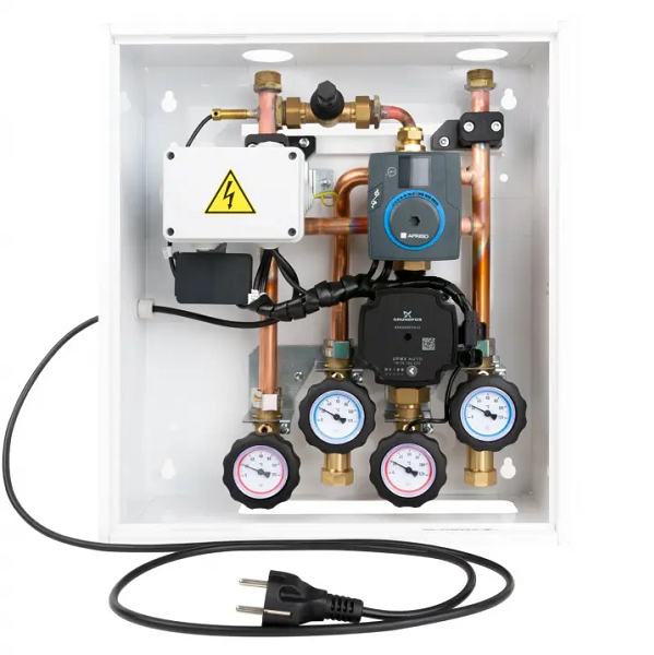 - Wyposażony w pompę Grundfos UPM3, zawór mieszający, zawór upustowy różnicy ciśnień DU, zawory odcinające z wbudowanymi termometrami.