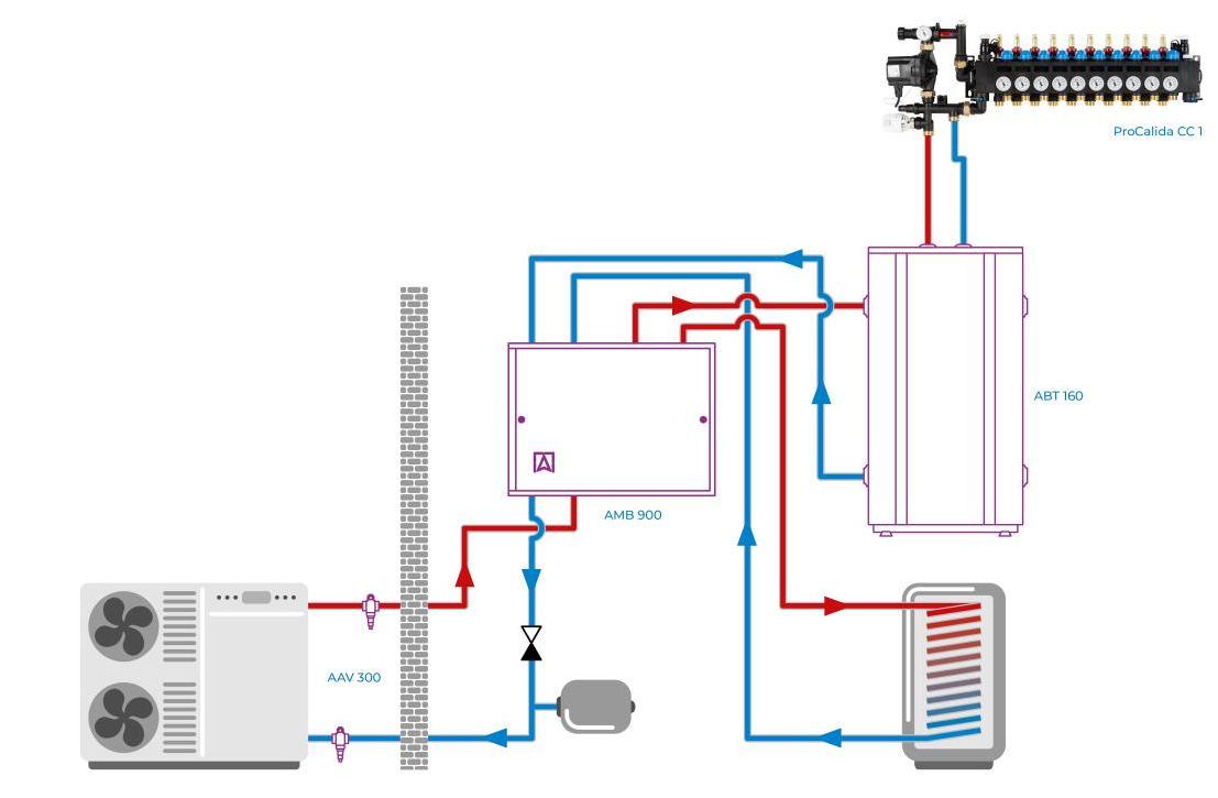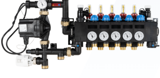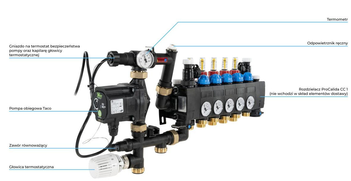 - Montowany między źródłem ciepła / chłodu a rozdzielaczem ProCalida CC 1.