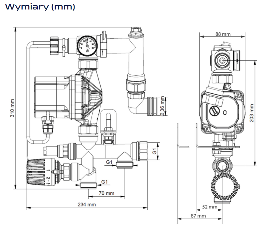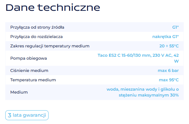 - Wyposażony w głowicę termostatyczną, która utrzymuje stałą temperaturę zasilania ustawioną na pokrętle w zakresie 20÷55°C.