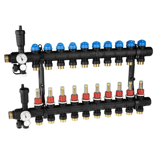 - Rozprowadza ciepło/chłód ze źródła na poszczególne pętle instalacji płaszczyznowej.