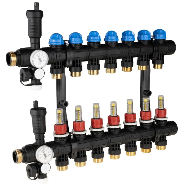 AFRISO PROCALIDA EF1 POLIAMIDOWY 7 OBWODOWY ROZDZIELACZ DO OGRZEWANIA PODŁOGOWEGO Z ZAWORAMI TERMOSTATYCZNYMI I PRZEPŁYWOMIERZAMI 81 367 (wyposażony w odpowietrznik auto oraz termometry)