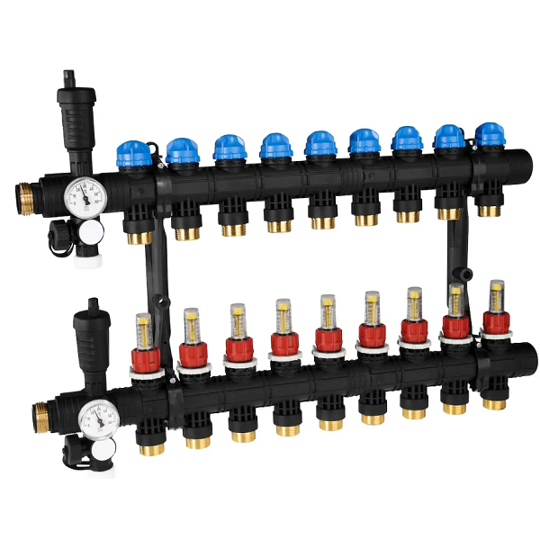 - Rozprowadza ciepło/chłód ze źródła na poszczególne pętle instalacji płaszczyznowej.