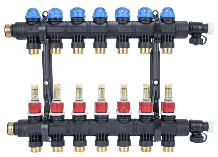 - Rozprowadza ciepło / chłód ze źródła na poszczególne pętle instalacji płaszczyznowej.