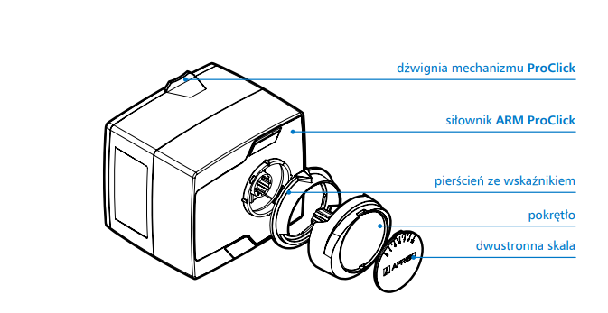 Siłowniki elektryczne ARM ProClick przeznaczone są do sterowania obrotowymi zaworami mieszającymi, które wymagają maksymalnego momentu obrotowego 6 Nm. Ich zakres obrotu to 90°. Możliwe jest również operowanie siłownikiem w trybie ręcznym przy użyciu pokrętła. Dwustronna skala na pokrętle określa stopień otwarcia zaworu. Duże diody LED wskazują kierunek obrotu zaworu oraz działanie wyłącznika pomocniczego. Ręczne obracanie zaworu jest możliwe dzięki zastosowaniu prostego w użyciu sprzęgła w formie przycisku. Siłowniki dostarczane są z przewodem elektrycznym o długości 2 m z żyłami wyraźnie oznaczonymi kolorami. Przewód połączony jest z siłownikiem poprzez wtyczkę, zabezpieczoną pokrywką. Montaż siłownika ARM ProClick na zaworach mieszających ARV ProClick odbywa się bez użycia narzędzi oraz bez dodatkowych części czy adapterów. Siłowniki ARM ProClick można zamontować także na zawory poprzedniej generacji ARV oraz na zaworach innych producentów.