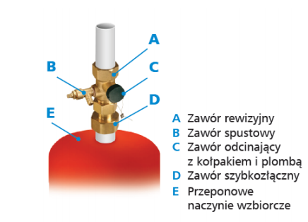 Zawór rewizyjny umożliwia odcięcie naczynia wzbiorczego od instalacji na czas jego kontroli lub konserwacji. Woda z naczynia wzbiorczego może zostać wypuszczona przez zaworek spustowy. Zawór rewizyjny posiada plastikową osłonę z możliwością zaplombowania po przeprowadzeniu konserwacji.