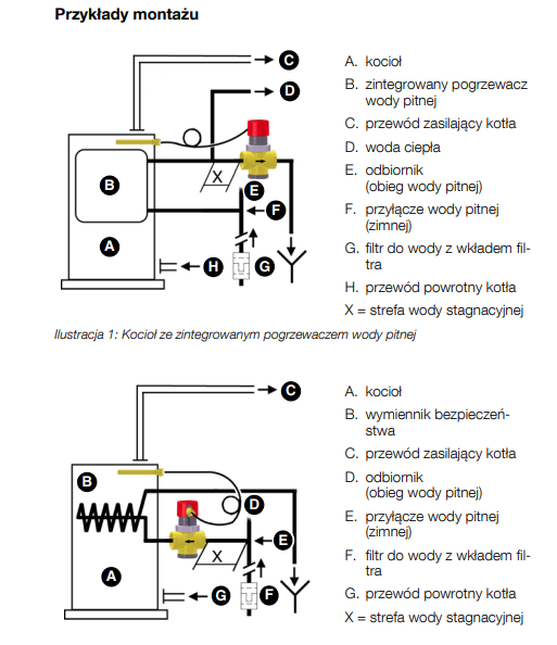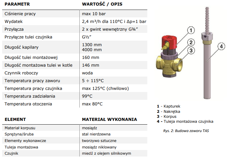 Budowę temperaturowego zaworu ochronnego kotła przedstawiono na rysunku powyżej. Temperaturowy zawór ochronny kotła TAS składa się z zaworu odcinającego, tulei pomiarowej, w której skład wchodzą dwa niezależne czujniki temperatury wypełnione cieczą oraz tulei montażowej. Kapilara czujnika chroniona jest przed uszkodzeniem przez metalową giętką osłonę. Po przekroczeniu granicznej temperatury 99°C zawór poprzez element termostatyczny otwiera dopływ zimnej wody z sieci, przez co zapobiega przekroczeniu maksymalnej temperatury w kotle.