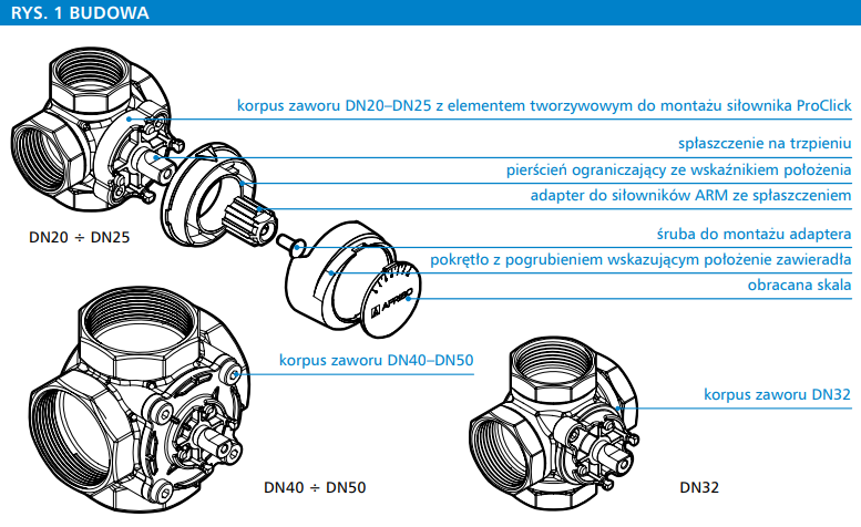 4-drogowe obrotowe zawory mieszające ARV ProClick zgwintem wewnętrznym wykonane są zmosiądzu. Przyłącza mają formę ośmiokąta. Zawory wyposażone są wpokrętła do regulacji ręcznej iograniczniki kąta obrotu. Obrotowa skala na jednej stronie zadrukowana jest podziałką „od 0 do 10”, zaś na drugiej stronie znajduje się podziałka „od 10 do 0”. Umożliwia to pracę zaworu wróżnych pozycjach montażowych. Pogrubiony fragment obwodu pokrętła odzwierciedla położenie zawieradła wewnątrz zaworu. Pokrętło wykonane jest zantypoślizgowego materiału. Do połączenia zaworów ARV ProClick zsiłownikami ARM służą elementy wykonane zwytrzymałego tworzywa sztucznego znajdujące się pod pokrętłem. Dzięki nim siłowniki ARM ProClick montowane są bez użycia narzędzi. Zawory ARV ProClick wymagają użycia niskiego momentu do ich obracania.
