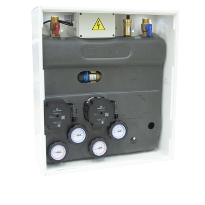 Zestawy PrimoBox AZB ze sprzęgłem hydraulicznym są przeznaczone do hydraulicznej separacji źródła ciepła i dwóch lub trzech stref grzewczych. Poszczególne strefy mogą być zarówno zasilane obiegami bezpośrednimi bez mieszania, jak i medium o temperaturze niższej, uzyskiwanej dzięki mieszaniu. Zestawy mieszające PrimoBox AZB gwarantują prawidłowe natężenie przepływu medium i prawidłową pracę pomp we wszystkich obiegach instalacji grzewczej dzięki wbudowanemu sprzęgłu hydraulicznemu. Metalowa szafka zestawu przeznaczona jest do montażu na lub w ścianie.