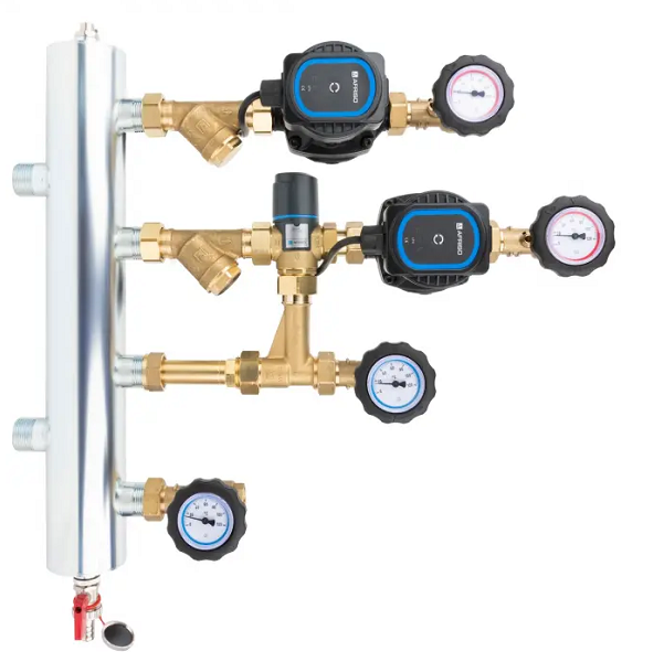 Zestawy mieszające ze sprzęgłem hydraulicznym BPS służą do połączenia źródła ciepła z dwoma obiegami instalacji grzewczej zgodnej z PN-EN 12828. Mogą służyć do przyłączenia np. instalacji grzejnikowej, ładowania zbiornika na ciepłą wodę użytkową lub płaszczyznowej (np. podłogowej). Zastosowanie sprzęgła hydraulicznego w instalacji, które jest elementem zestawów, zapewnia separację obiegów pompowych – obiegu pompowego źródła ciepła oraz obiegów pompowych instalacji grzewczej. Pozwala to na zapewnienie właściwych warunków hydraulicznych pracy pomp obiegowych poprzez zrównoważenie przepływów. Umożliwia to płynną i efektywną pracę instalacji i źródła ciepła oraz zwiększa żywotność pomp obiegowych. Sprzęgło, dzięki swej budowie i właściwościom pomaga również w odpowietrzaniu oraz separacji zanieczyszczeń. Do usunięcia wytrąconego powietrza służy odpowietrznik ręczny, natomiast zanieczyszczenia należy usuwać przy użyciu zaworu spustowo-napełniającego KFE.
