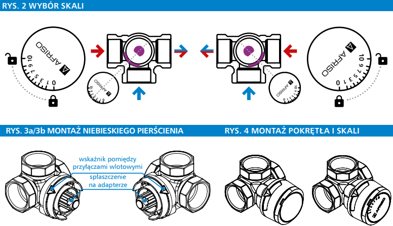 Uwaga! Spłaszczenie na trzpieniu zaworu ARV ProClick iadapterze, który zamontowany jest na nim (rys. 1) wskazuje środek zawieradła wewnątrz zaworu (rys. 2). Zawór mieszający ARV ProClick dostarczany jest zzamontowanym plastikowym pokrętłem, wraz zpierścieniem ograniczającym iskalą. Aby nie uszkodzić elementów plastikowych, zalecamy przed rozpoczęciem montażu zaworu winstalacji zdjąć pokrywkę ze skalą, anastępnie ściągnąć zzaworu pokrętło oraz niebieski pierścień ograniczający ze wskaźnikiem. Elementy te montowane są na zatrzask. Wrazie problemów ze ściągnięciem pokrętła, można je delikatnie podważyć śrubokrętem płaskim. Zamontować zawór winstalacji. Po zakończeniu wszystkich prac monterskich wpobliżu zaworu, można przystąpić do ustawienia zaworu iwyposażenia go welementy plastikowe. Wtym celu należy: 1. Ustalić zakres pracy zawieradła ikierunek zamykania zaworu mieszającego (rys. 2). Najpierw należy ustalić wlot wody gorącej oraz wlot wody zimnej zamontowanego wkonkretnej instalacji grzewczej zaworu. Zawieradło zaworu powinno się poruszać wzakresie 90° pomiędzy wlotem wody gorącej, awlotem wody zimnej. Następnie ustawić zawieradło dokładnie pośrodku, pomiędzy wlotem wody gorącej iwlotem wody zimnej (rys. 2). Warto też na tym etapie określić kierunek zamykania zaworu (zamykanie dopływu wody gorącej) iotwierania zaworu (otwieranie dopływu wody gorącej). 2. Wybrać odpowiednią stronę skali. Do zaworu ARV ProClick dołączono obrotową skalę, zadrukowaną dwustronnie: „od 0 do 10” oraz „od 10 do 0”. Należy ją „przyłożyć” do zaworu iwybrać tę skalę, wktórej „0” będzie się pokrywało zwlotem wody zimnej, ajednocześnie „10” będzie się pokrywało zwlotem wody gorącej tak, jak to pokazano na rys. 2. Do wyboru skali, można się też posłużyć inną, prostą regułą: – jeżeli zamykanie zaworu będzie się odbywało wprawo (zgodnie zruchem wskazówek zegara), wybieramy skalę „od 0 do 10”, – jeżeli zamykanie zaworu będzie się odbywało wlewo (odwrotnie do ruchu wskazówek zegara), wybieramy skalę „od 10 do 0”. 3. Na ustawiony według punktu 1. zawór nałożyć izatrzasnąć niebieski pierścień ograniczający, ze wskaźnikiem skierowanym na środek zawieradła (rys. 3a / 3b), czyli zgodnie zkierunkiem spłaszczenia na trzpieniu zaworu iadapterze. Wskaźnik powinien znaleźć się pomiędzy przyłączami wlotowymi zaworu. 4. Na adapter zaworu nałożyć pokrętło, które pasuje wyłączenie wjednej pozycji (rys. 4). 5. Na pokrętło nałożyć pokrywkę zwybraną skalą (rys. 4). Aby włożyć pokrywkę, należy mniejszy ząbek umieścić wotworze wpokrętle, anastępnie docisnąć wdół izatrzasnąć. 6. Sprawdzić poprawność działania zaworu.