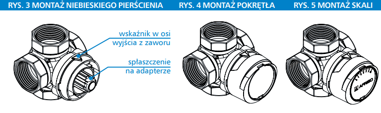 Zawór mieszający ARV ProClick dostarczany jest zzamontowanym plastikowym pokrętłem, wraz zpierścieniem ograniczającym iskalą. Aby nie uszkodzić elementów plastikowych, zalecamy przed rozpoczęciem montażu zaworu winstalacji zdjąć pokrywkę ze skalą, anastępnie ściągnąć zzaworu pokrętło oraz niebieski pierścień ograniczający ze wskaźnikiem. Elementy te montowane są na zatrzask. Wrazie problemów ze ściągnięciem pokrętła, można je delikatnie podważyć śrubokrętem płaskim. Zamontować zawór winstalacji. Po zakończeniu wszystkich prac monterskich wpobliżu zaworu, można przystąpić do ustawienia zaworu iwyposażenia go welementy plastikowe. Wtym celu należy: 1. Ustalić zakres pracy zawieradła ikierunek zamykania zaworu mieszającego (rys. 2). Najpierw należy ustalić wlot wody zasilającej zkotła, wyjście wody na instalację, powrót wody zinstalacji oraz powrót do kotła. Następnie ustawić zawieradło dokładnie wosi wyjścia na instalację oraz powrotu do kotła (rys. 2 – oś „s”). Odpowiada to otwarciu zaworu „na 50%”. Zawieradło powinno pracować wzakresie +/- 45° od tego położenia. 2. Ustalić kierunek zamykania zaworu iwybrać odpowiednią skalę. 4-drogowy zawór mieszający uważamy za całkowicie zamknięty, gdy zawieradło położone jest wosi „z” (rys. 2a i2b). Cała woda zasilająca zkotła kierowana jest na powrót do kotła. Odpowiada to pozycji „0” na skali pokrętła. Wzależności od pozycji instalacyjnej zaworu, zamykanie zaworu następuje przez przekręcenie trzpienia zaworu wlewo (rys. 2a) lub wprawo (rys. 2b). 4-drogowy zawór mieszający uważamy za całkowicie otwarty, gdy zawieradło położone jest wosi „o” (rys. 2a i2b). Cała woda gorąca zkotła kierowana jest wtedy do instalacji. Odpowiada to pozycji „10” na skali pokrętła. Wzależności od pozycji instalacyjnej zaworu, otwieranie zaworu następuje przez przekręcenie trzpienia zaworu wprawo (rys. 2a), lub wlewo (rys. 2b). Do zaworu ARV ProClick dołączono obrotową pokrywkę zadrukowaną dwustronnie: „od 0 do 10” oraz „od 10 do 0”. Należy dokonać wyboru odpowiedniej skali, zgodnie zregułą: – jeżeli zamykanie zaworu będzie się odbywało wprawo (zgodnie zruchem wskazówek zegara), wybieramy skalę „od 0 do 10”, – jeżeli zamykanie zaworu będzie się odbywało wlewo (odwrotnie do ruchu wskazówek zegara), wybieramy skalę „od 10 do 0”. 3. Na ustawiony wpunkcie 1. zawór nałożyć izatrzasnąć niebieski pierścień ograniczający, ze wskaźnikiem skierowanym zgodnie zkierunkiem spłaszczenia na trzpieniu iadapterze zaworu (rys. 3). Wskaźnik powinien znaleźć się wosi przyłączy wyjściowych zzaworu. 4. Na adapter zaworu nałożyć pokrętło, które pasuje wyłączenie wjednej pozycji (rys. 4). 5. Na pokrętło nałożyć pokrywkę zwybraną skalą (rys. 5). Aby włożyć pokrywkę, należy mniejszy ząbek umieścić wotworze wpokrętle, anastępnie docisnąć wdół izatrzasnąć. 6. Sprawdzić poprawność działania zaworu.