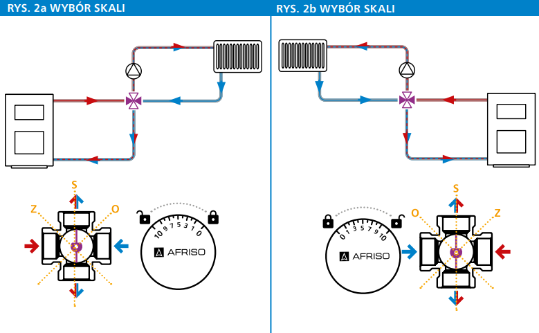 Zawór mieszający ARV ProClick dostarczany jest zzamontowanym plastikowym pokrętłem, wraz zpierścieniem ograniczającym iskalą. Aby nie uszkodzić elementów plastikowych, zalecamy przed rozpoczęciem montażu zaworu winstalacji zdjąć pokrywkę ze skalą, anastępnie ściągnąć zzaworu pokrętło oraz niebieski pierścień ograniczający ze wskaźnikiem. Elementy te montowane są na zatrzask. Wrazie problemów ze ściągnięciem pokrętła, można je delikatnie podważyć śrubokrętem płaskim. Zamontować zawór winstalacji. Po zakończeniu wszystkich prac monterskich wpobliżu zaworu, można przystąpić do ustawienia zaworu iwyposażenia go welementy plastikowe. Wtym celu należy: 1. Ustalić zakres pracy zawieradła ikierunek zamykania zaworu mieszającego (rys. 2). Najpierw należy ustalić wlot wody zasilającej zkotła, wyjście wody na instalację, powrót wody zinstalacji oraz powrót do kotła. Następnie ustawić zawieradło dokładnie wosi wyjścia na instalację oraz powrotu do kotła (rys. 2 – oś „s”). Odpowiada to otwarciu zaworu „na 50%”. Zawieradło powinno pracować wzakresie +/- 45° od tego położenia. 2. Ustalić kierunek zamykania zaworu iwybrać odpowiednią skalę. 4-drogowy zawór mieszający uważamy za całkowicie zamknięty, gdy zawieradło położone jest wosi „z” (rys. 2a i2b). Cała woda zasilająca zkotła kierowana jest na powrót do kotła. Odpowiada to pozycji „0” na skali pokrętła. Wzależności od pozycji instalacyjnej zaworu, zamykanie zaworu następuje przez przekręcenie trzpienia zaworu wlewo (rys. 2a) lub wprawo (rys. 2b). 4-drogowy zawór mieszający uważamy za całkowicie otwarty, gdy zawieradło położone jest wosi „o” (rys. 2a i2b). Cała woda gorąca zkotła kierowana jest wtedy do instalacji. Odpowiada to pozycji „10” na skali pokrętła. Wzależności od pozycji instalacyjnej zaworu, otwieranie zaworu następuje przez przekręcenie trzpienia zaworu wprawo (rys. 2a), lub wlewo (rys. 2b). Do zaworu ARV ProClick dołączono obrotową pokrywkę zadrukowaną dwustronnie: „od 0 do 10” oraz „od 10 do 0”. Należy dokonać wyboru odpowiedniej skali, zgodnie zregułą: – jeżeli zamykanie zaworu będzie się odbywało wprawo (zgodnie zruchem wskazówek zegara), wybieramy skalę „od 0 do 10”, – jeżeli zamykanie zaworu będzie się odbywało wlewo (odwrotnie do ruchu wskazówek zegara), wybieramy skalę „od 10 do 0”. 3. Na ustawiony wpunkcie 1. zawór nałożyć izatrzasnąć niebieski pierścień ograniczający, ze wskaźnikiem skierowanym zgodnie zkierunkiem spłaszczenia na trzpieniu iadapterze zaworu (rys. 3). Wskaźnik powinien znaleźć się wosi przyłączy wyjściowych zzaworu. 4. Na adapter zaworu nałożyć pokrętło, które pasuje wyłączenie wjednej pozycji (rys. 4). 5. Na pokrętło nałożyć pokrywkę zwybraną skalą (rys. 5). Aby włożyć pokrywkę, należy mniejszy ząbek umieścić wotworze wpokrętle, anastępnie docisnąć wdół izatrzasnąć. 6. Sprawdzić poprawność działania zaworu.