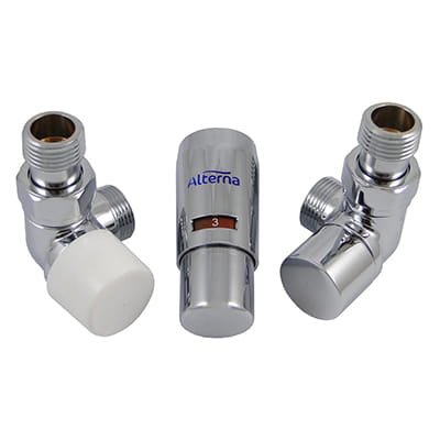 Zestawy zaworów Mini Alterna przeznaczone są do montażu na grzejnikach centralnego ogrzewania z zasilaniem bocznym, grzejnikach łazienkowych oraz dekoracyjnych. Dają możliwość indywidualnego odcinania grzejnika podczas eksploatacji lub wymiany grzejnika bez konieczności opróżniania instalacji z czynnika grzewczego. Termostatyczny zawór wraz głowicą termostatyczną automatycznie reguluje przepływ wody przez grzejnik w celu utrzymywania zadanej temperatury w pomieszczeniu. Zawory powrotne posiadają również funkcję nastawy wstępnej wykorzystywanej do regulacji przepływów w instalacji centralnego ogrzewania. W zależności od posiadanej instalacji, można zastosować złączki zaciskowe do rur miedzianych 15×1, PEX 16×2, które dostępne są osobno.