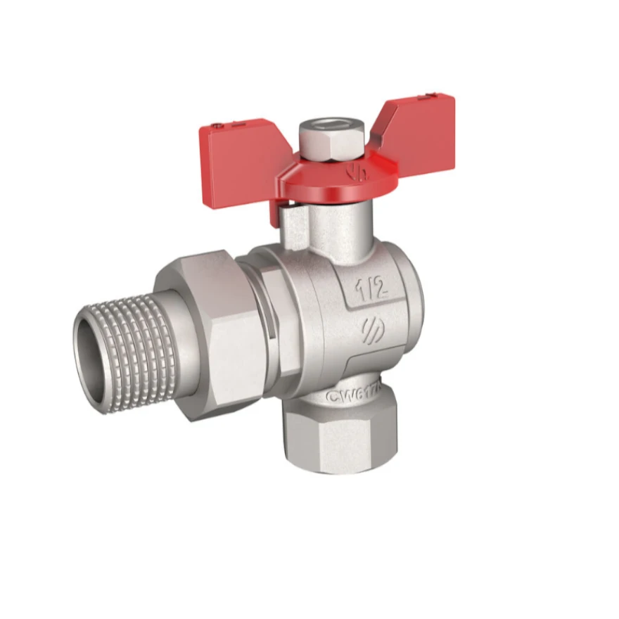 Zawór kulowy kątowy z półśrubunkiem, uchwyt motylkowy,1/2GW x 1/2GZ, nikiel.