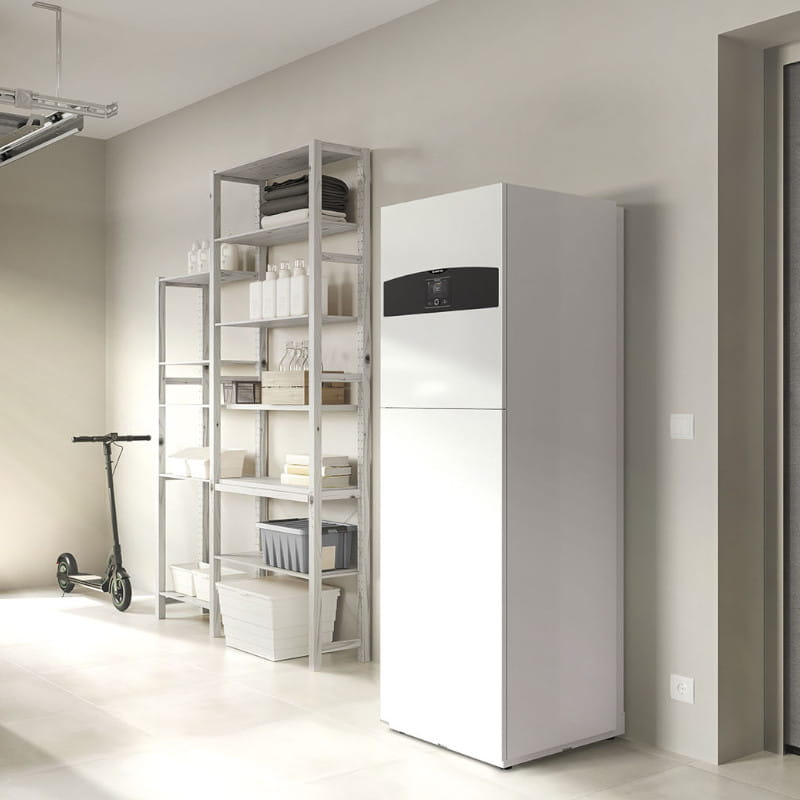 - Ultrakompaktowa jednostka wewnętrzna (600×600) ze zintegrowanym zasobnikiem 180 l, powiększoną wężownicą i 12 l naczyniem wzbiorczym w standardzie