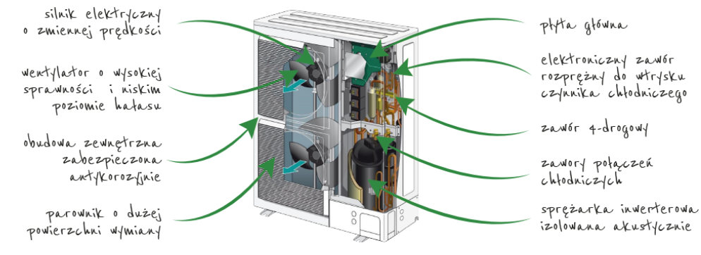 Dzięki najnowocześniejszym rozwiązaniom technicznym zewnętrzny moduł charakteryzuje bardzo cicha praca, generująca hałas na poziomie około 46 dB.