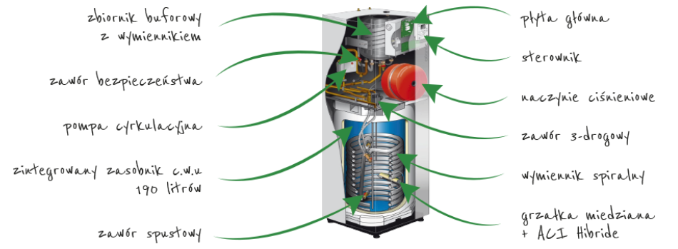 - Zintegrowany zasobnik ciepłej wody użytkowej o pojemności 190 L -stal emaliowana