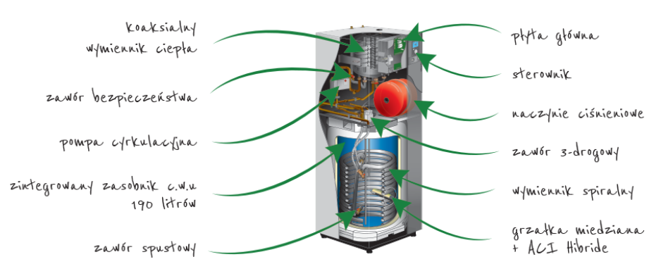 - Zintegrowany 190l zasobnik C.W.U – stal emaliowana