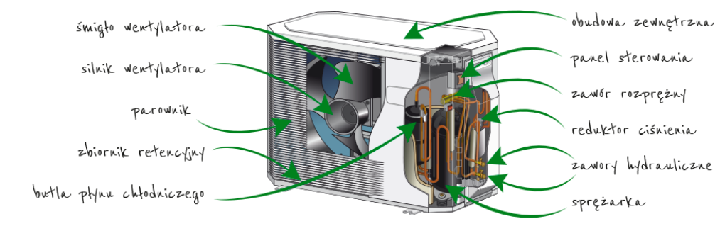 Moduł ten montowany jest nazewnątrz budynku. Składasię on zwentylatora, sprężarki, parownika oraz zaworu rozprężnego.