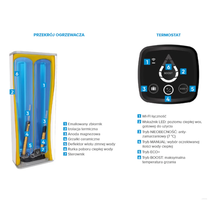 • Tryb przyspieszonej pracy BOOST (dodatkowy prysznic w mniej niż 30 min)