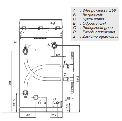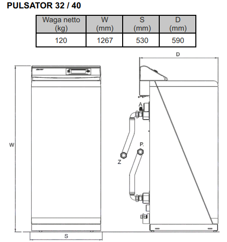 | Wymiary kotła wys x szer x głęb (mm) | 1267 x 550 x 595 |