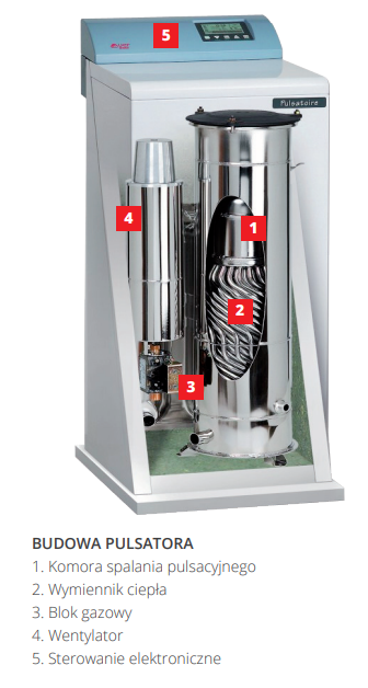 - Wymiennik ciepła i komora spalania kotła pulsacyjnego są całkowicie zanurzone w wodzie, dzięki temu powstaje duża powierzchnia wymiany ciepła. Zapewnia to doskonałą sprawność urządzenia.