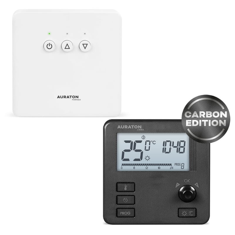 Bezprzewodowy tygodniowy regulator temperatury w zestawie ze sterownikiem urządzenia grzewczego pracuje w trybie ogrzewania lub chłodzenia. Unikalny algorytm analizy cyklu grzania pozwala na zapis parametru pracy odbiornika z ostatnich 24 h. AURATON Libra SET umożliwia użytkownikowi zarządzanie 7 niezależnie konfigurowanymi programami, jak również wyposażony jest w fabrycznie ustawioną temperaturę przeciwzamrożeniową. Regulator ma ergonomiczny kształt, który pozwala na łatwy montaż oraz dedykowany wyłącznik ułatwiający serwis urządzenia grzewczego. Regulator temperatury wyposażony jest w tryb pracy PWM, polegający na cyklicznym załączaniu i wyłączaniu urządzenia grzewczego minimalizując wahania temperatur. Algorytm PWM utrzymuje komfort cieplny w pomieszczeniu wyprzedzając zachowania układu grzewczego, jednocześnie dbając o niższe zużycie energii.