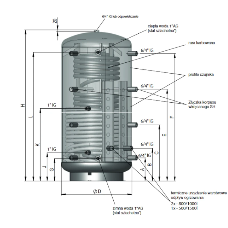 Nasza gama zbiorników buforowych KWS-W oferuje szeroki wybór, w tym dostępność trzech modeli o pojemnościach od 800 do 1500 litrów. Możesz dostosować zbiornik do swoich indywidualnych potrzeb i warunków, zapewniając optymalną pracę systemu grzewczego.