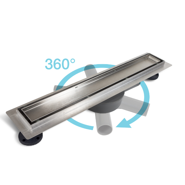 Odpływ liniowy360 Drainz obrotowym syfonem, daje możliwośćustawienia rury odpływowej w dowolnym kierunku. Takie rozwiązanie znacznieułatwia montażi podłączenie do instalacji kanalizacyjnej.