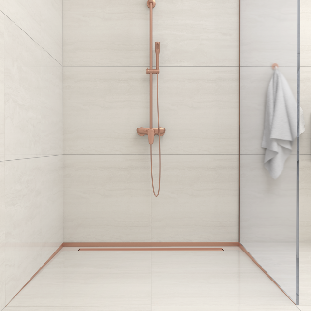 Listwy spadkowe prysznicowe BALNEO® występują w dwóch długościach (120 cm i 130 cm oraz czterech kolorach (inox, czarna, złota, miedziana) tak aby pasowały do różnych rozmiarów kabin prysznicowych i wnętrz.