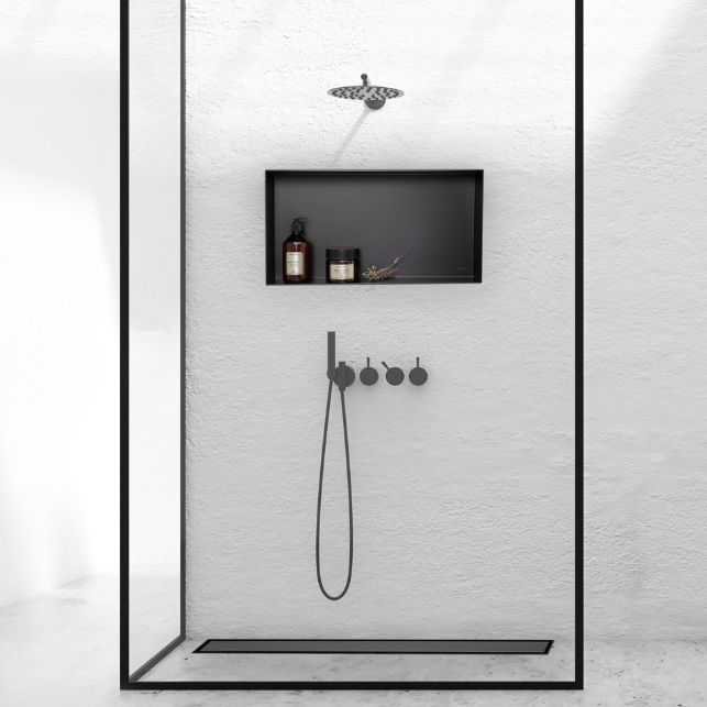 Półki wnękoweWALL-BOX No Rimpozwalają uporządkować przestrzeńw łazience inadają jej nowoczesnego designu. Na łatwo dostępnych półkach można ustawić kosmetyki, perfumy a w kabinie prysznicowej – szampony, żele i inne artykuły kąpielowe.