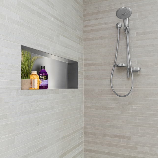 Półki wnękoweWALL-BOX No Rimpozwalają uporządkować przestrzeńw łazience inadają jej nowoczesnego designu. Na łatwo dostępnych półkach można ustawić kosmetyki, perfumy a w kabinie prysznicowej – szampony, żele i inne artykuły kąpielowe.